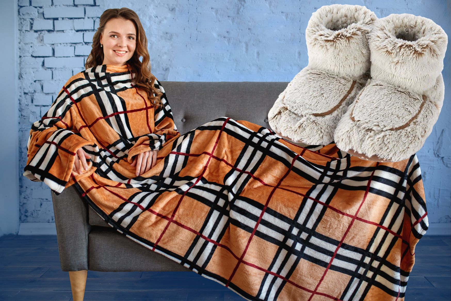Комплект состоит из пледа с рукавами и пары cапожек-грелок.