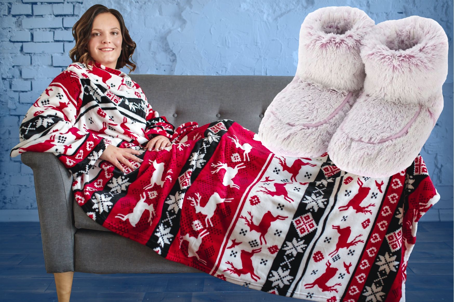 Комплект состоит из пледа с рукавами и пары cапожек-грелок.