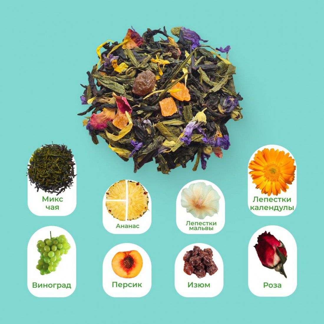 Представленный чай это эффектное сочетание кусочков ананаса и красного изюма, приторность которых разбавлена лепестками красной розы, календулы, мальвы.