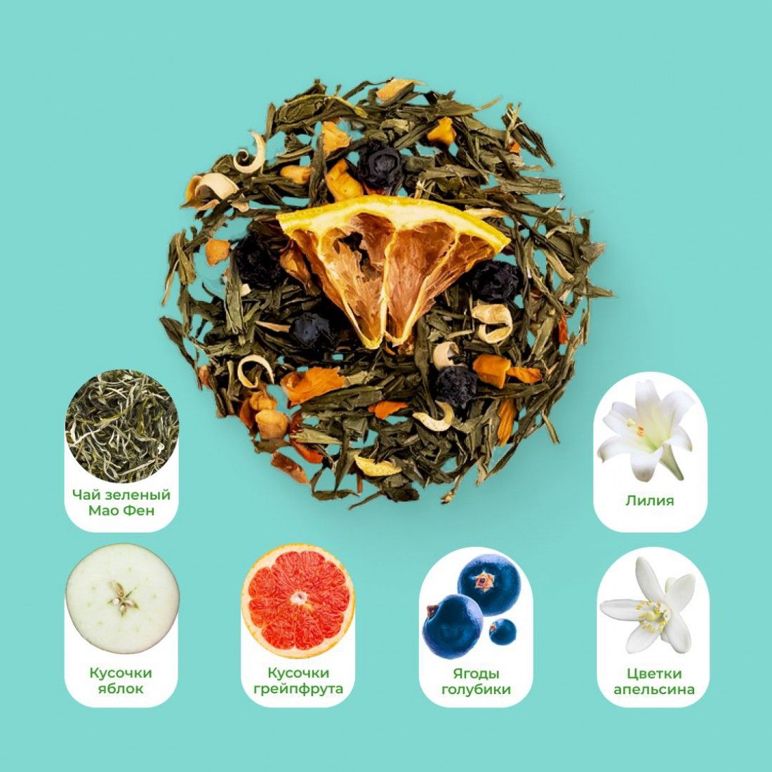 Оригинальная композиция зеленого чая с цветочным ароматом и свежестью грейпфрута. Дарит позитивный настрой, хорошее настроение и прилив сил.