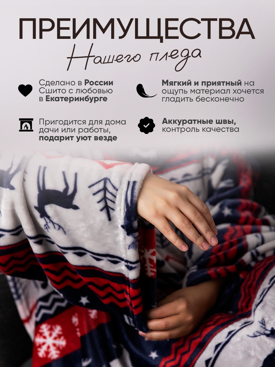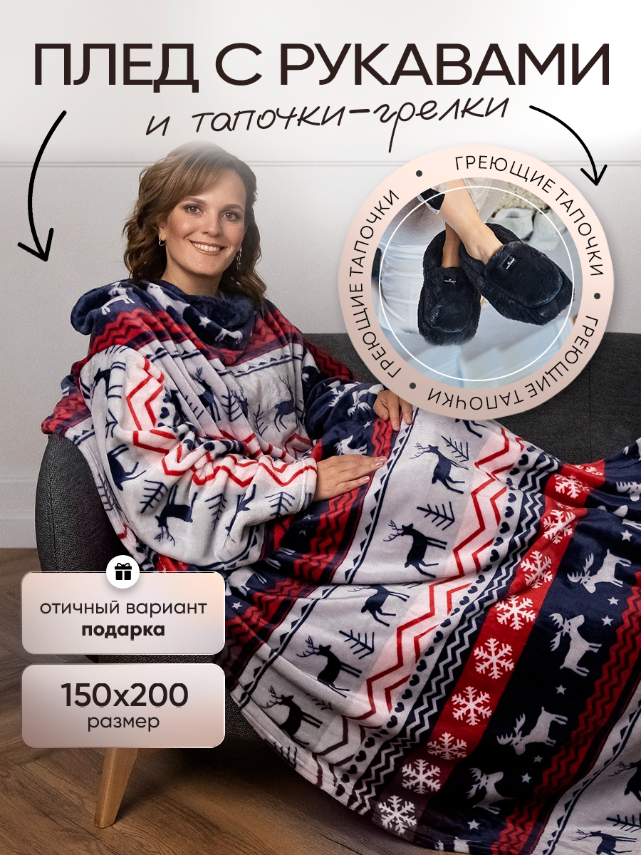 Комплект состоит из пледа с рукавами и пары тапочек-грелок.